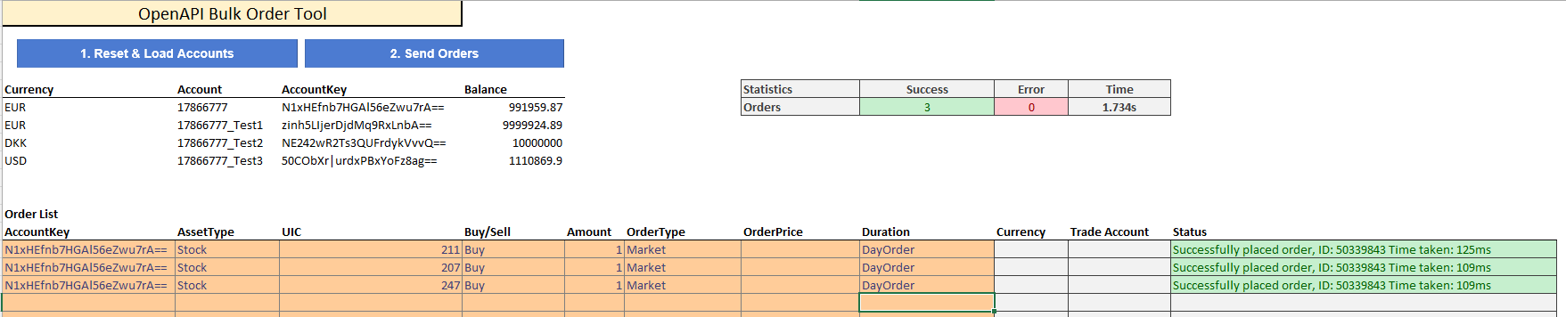 - Bulk-order placement (on the "Trade" sheet), which: