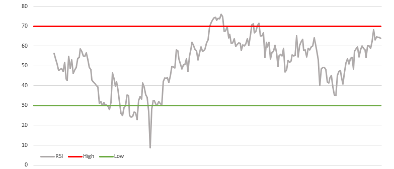 - RSI look-back window is set to 14 periods, with highs at 70 and lows at 30.