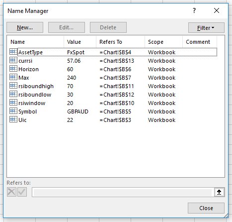 Which compares very well to the Excel implementation. In addition, the current values of RSI are both in agreement at 63.88, indicating that this currency cross is close to being oversold (given the above assumptions).