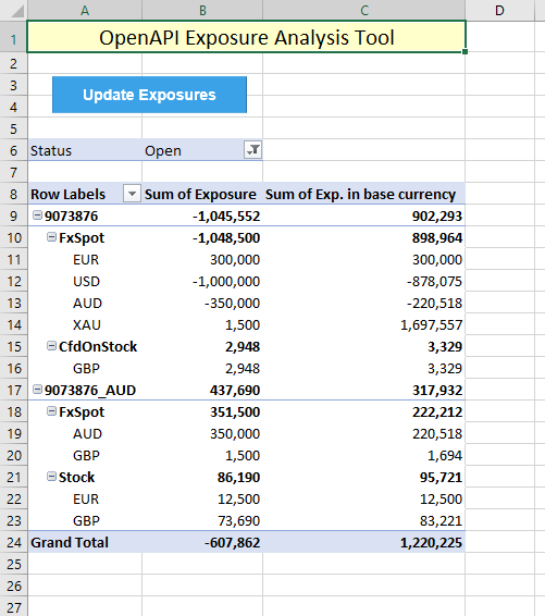 The objective is to create a dynamic pivot table, which automatically updates to the latest data from the OpenAPI with a single click. The data can contain any number of accounts, currencies, AssetTypes and positions. The user can adjust the fields in the pivot table and build their own reports accordingly. This is a helpful tool to identify potential foreign exchange risk in a portfolio and trade FX accordingly to cover exposure.