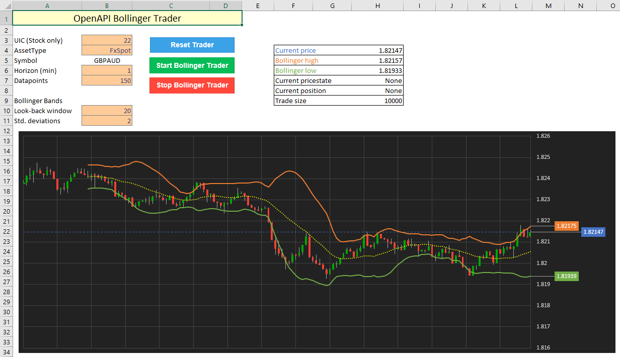 We will reuse the Bollinger Band live chart built in Tutorial 6.1 because it's a great indicator for visual representation and will clearly show us when the current instrument price breaks through one of the bands. The trading rule implemented in this sheet is: