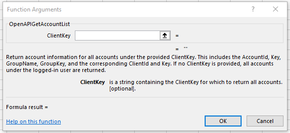 Because the OpenAPI for Excel add-in is basically an API wrapper, every generic function's first argument is always the endpoint to which a request is sent, including query string parameters. Subsequent arguments depend on multiple factors: the function and its method (GET, PATCH, PUT, etc.), and which endpoint the request is sent to. Endpoints returning data require fields to be specified in order to populate output arrays (see Data Model). The Formula Builder is a useful tool for exploring the correct syntax for function arguments.