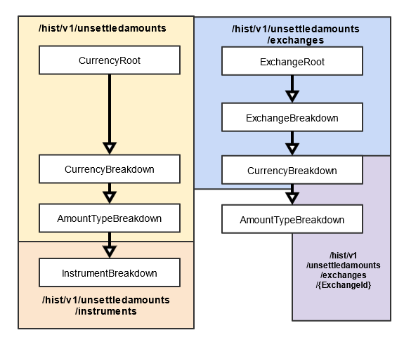 | ExchangeRoot | Aggregates in the requesting entity's currency, providing an array of CashFlow to show date specific amounts due. Has a child array, Exchanges, consisting of an array of ExchangeBreakdown objects. | /unsettledamounts/exchanges |
